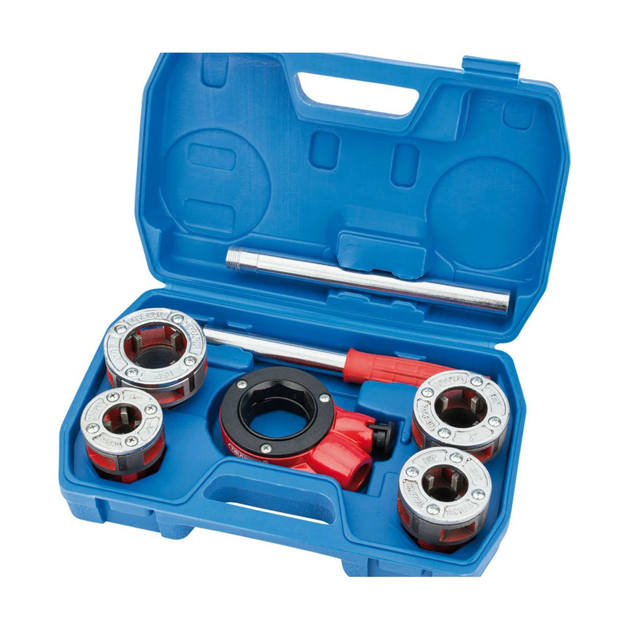 Suitable for threading black gas or galvanized iron pipes. Kit comprises four dieheads, two-piece tubular steel handle and compact ratchet head. The compact ratchet head is suitable for working close to walls etc. Cast iron dieheads with alloy steel dies, four chasers per head for a clean accurate thread and four waste holes for quick dispersion of swarf. Packed in blow mould carrying case and display sleeve.Contents: Metric Set: 16, 20, 25 and 32mm dieheadsContents: Imperial Set: 1/2″, 3/4″, 1″ and 1.1/4″ BSP dieheads